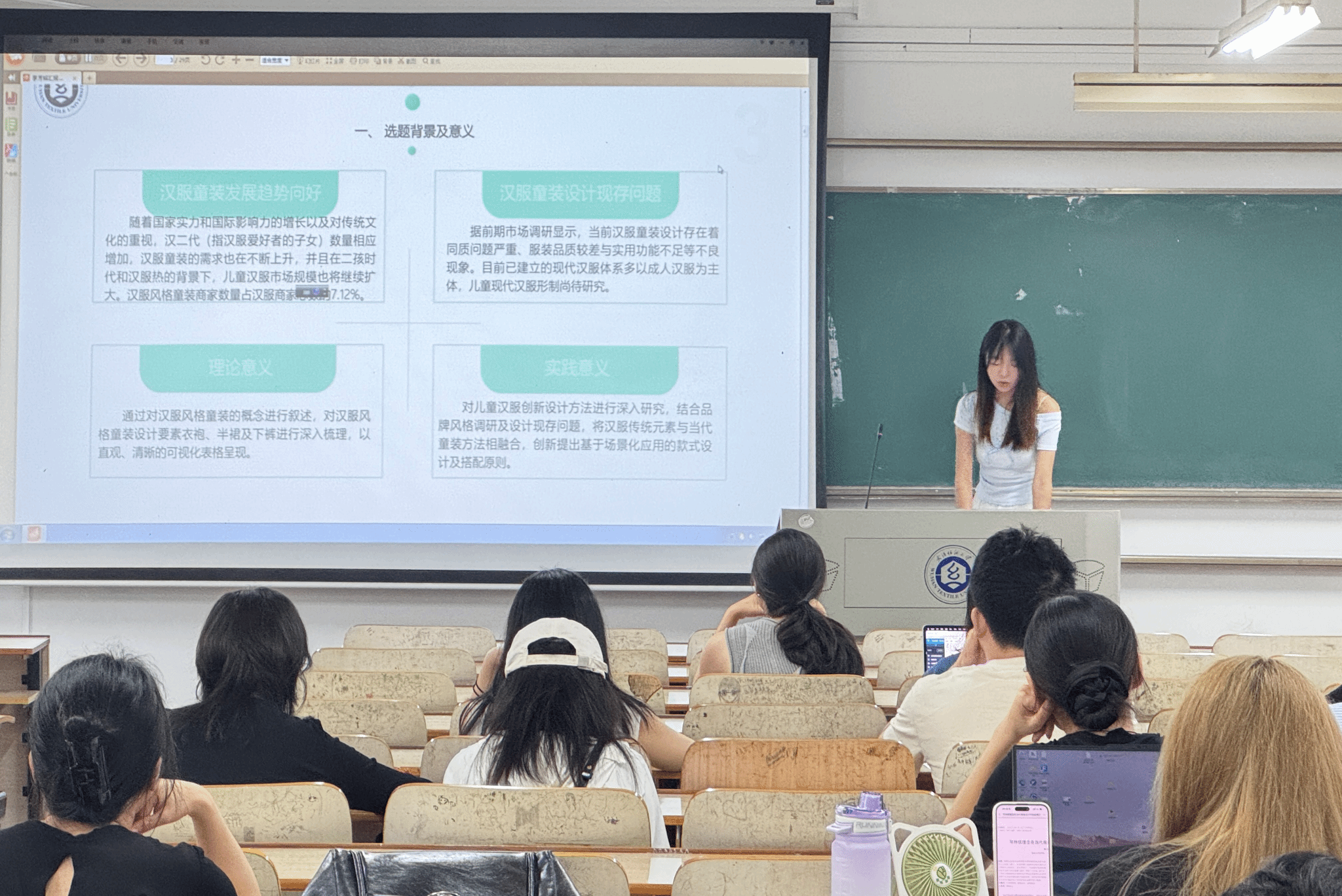李芳铭同学分享的论文为《汉服风格童装设计研究》,以汉服风格童装为研究对象,对史书所记载的童装汉服进行复刻与创新设计实践。通过传统纹样符号转译机制实现文化象征功能与童装装饰美学的有机统一,提高汉服童装的视觉识别接受度。此外,她建议大家注重文献阅读与综述,积极参与学术交流。