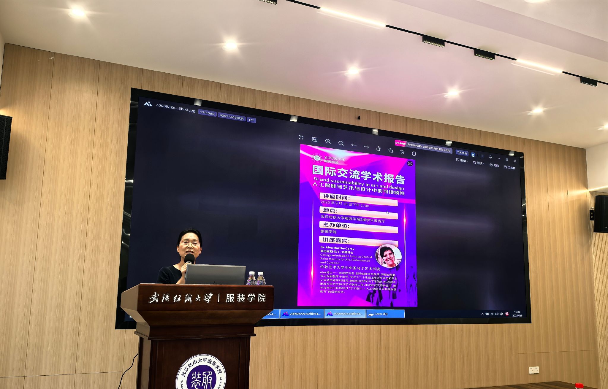 的前沿研究案例,展示了AI在预测流行趋势、减少设计试错成本、优化版型生成以降低面料浪费,以及推动环保材料智能匹配中的实际应用。她指出:“人工智能不仅是效率工具,更是一种思维范式——它帮助设计师从线性生产转向循环系统思维,真正实现‘设计即责任’。”特别值得关注的是,这些跨学科实践不仅提升了设计的环境友好性,也为艺术教育的未来提供了新的教学框架与研究方向。在随后的互动环节,现场研究生与留学生积极提问,Alex博士做了精彩的解答,现场气氛热烈。