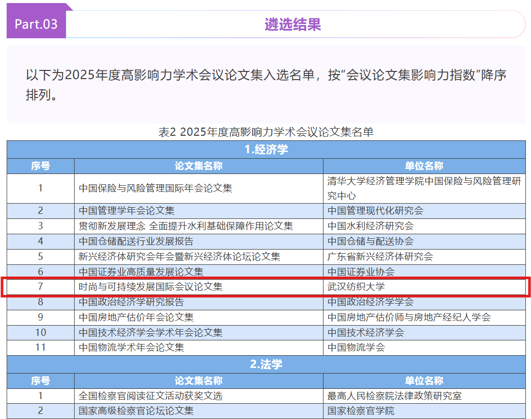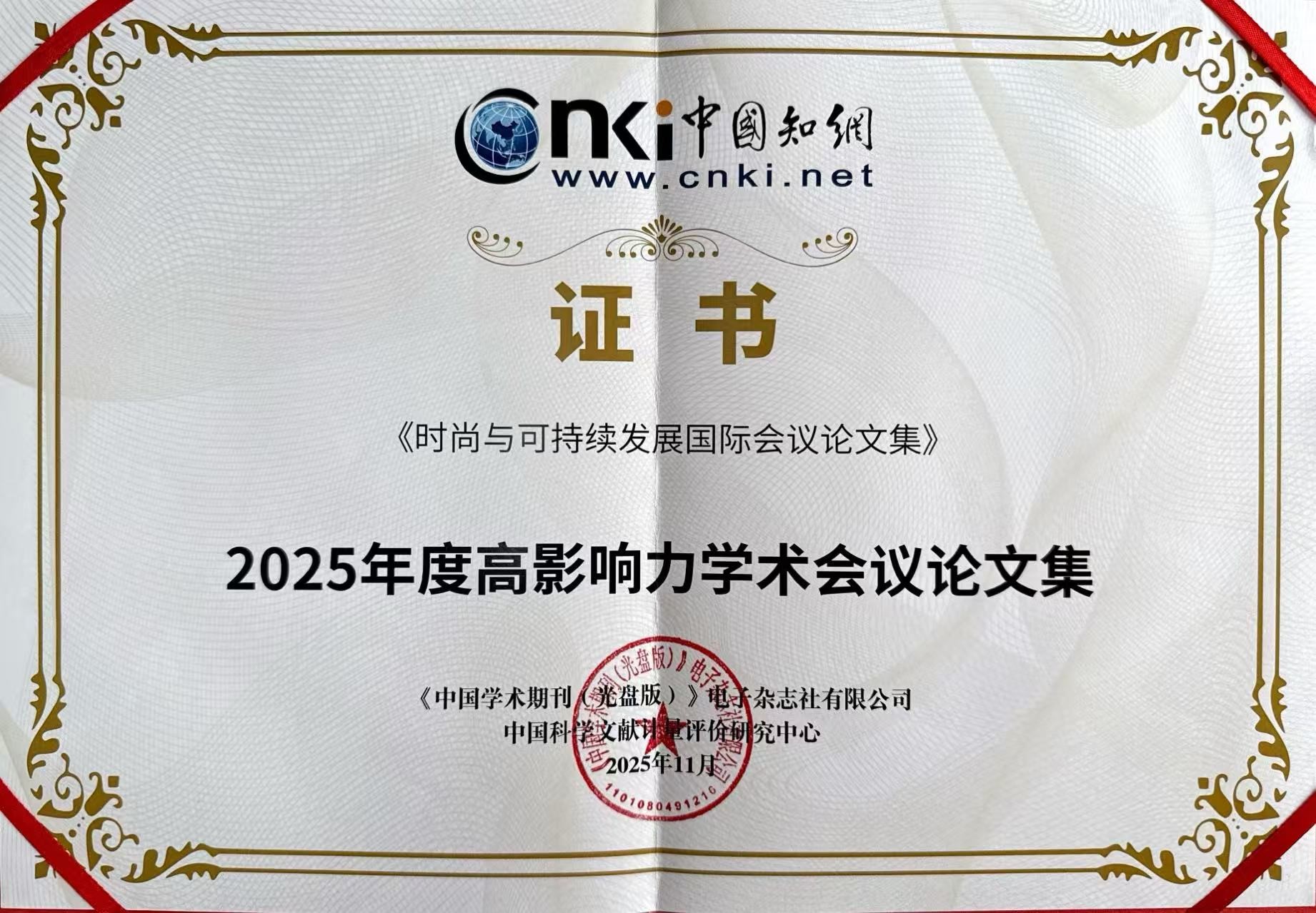 2025年11月6日,中国知网·中国科学文献计量评价研究中心重磅发布《高影响力学术会议论文集评价报告(2025)》。由第二届时尚与可持续发展国际会议组委会编纂的《会议论文集》凭借其国际化的学术视野和前瞻性的引领价值,从中国知网收录的全国3162册参评论文集中脱颖而出,荣登“2025年度高影响力学术会议论文集”榜单。