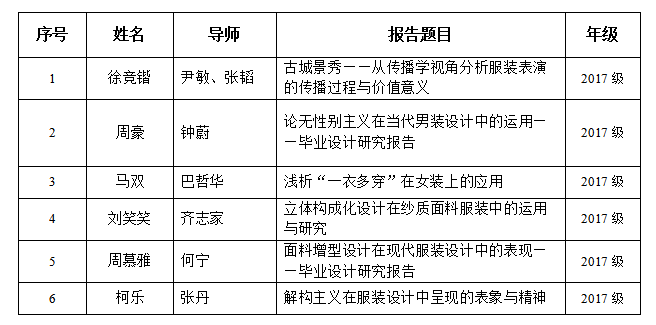 本次论坛旨在鼓励服装与服饰设计专业本科生要善于利用大数据及中国传统文化等元素提升创新设计水平,激发学生自主学习的兴趣。论坛第二期以设计为主,邀请了徐竞锴、周豪、马双、刘笑笑、周慕雅、柯乐等六位毕业作品与论文答辩取得优异成绩的本科毕业生,他们分别汇报了自己的设计与毕业论文并与大家分享了学习心得。