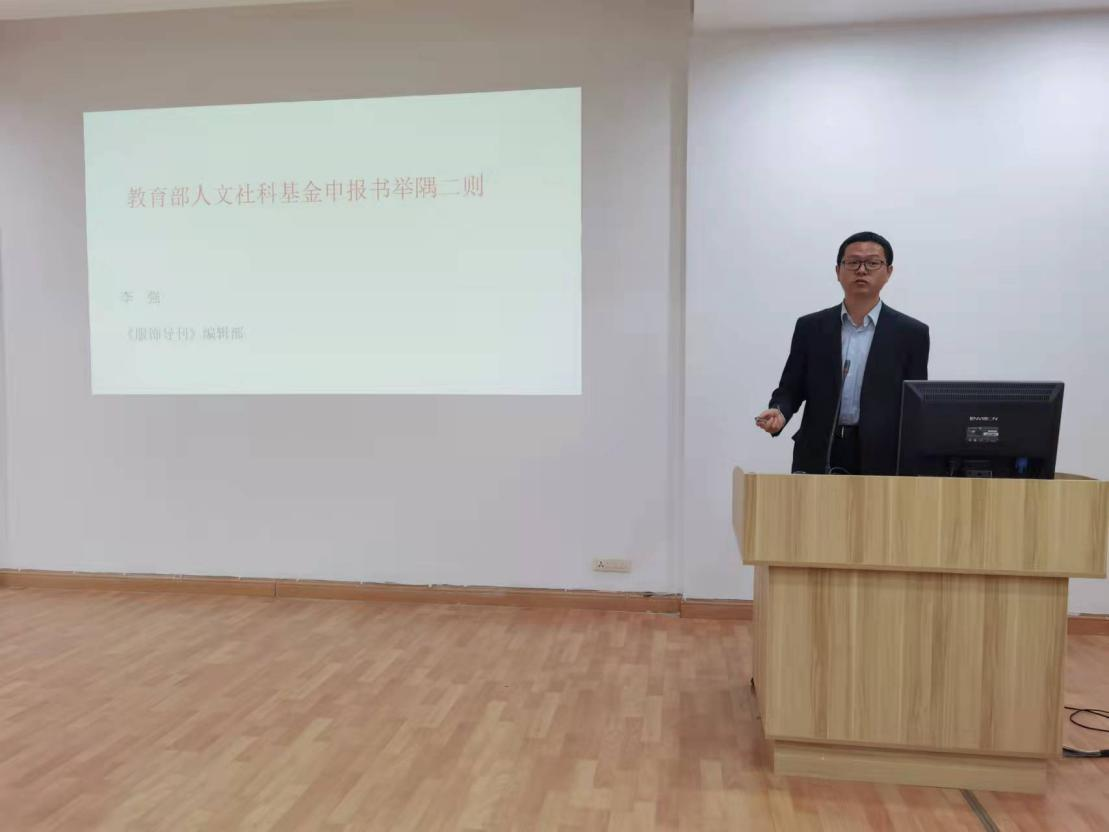 本期阳光论坛邀请了学校期刊社李强博士为全院教师作了题为“教育部人文社科基金申报书举隅二则(纺织服饰方向)”的报告。