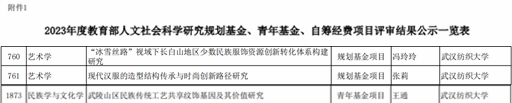 2023年9月15日教育部人文社会科学研究基金项目公示。来自我院冯玲玲教授的研究项目《“冰雪丝路”视域下长白山地区少数民族服饰资源创新转化体系构建研究》、张莉副教授的《现代汉服的造型结构传承与时尚创新路径研究》、王通博士的《武陵山区民族传统工艺共享纹饰基因及其价值研究》成功获得2023年度教育部项目的立项支持。
