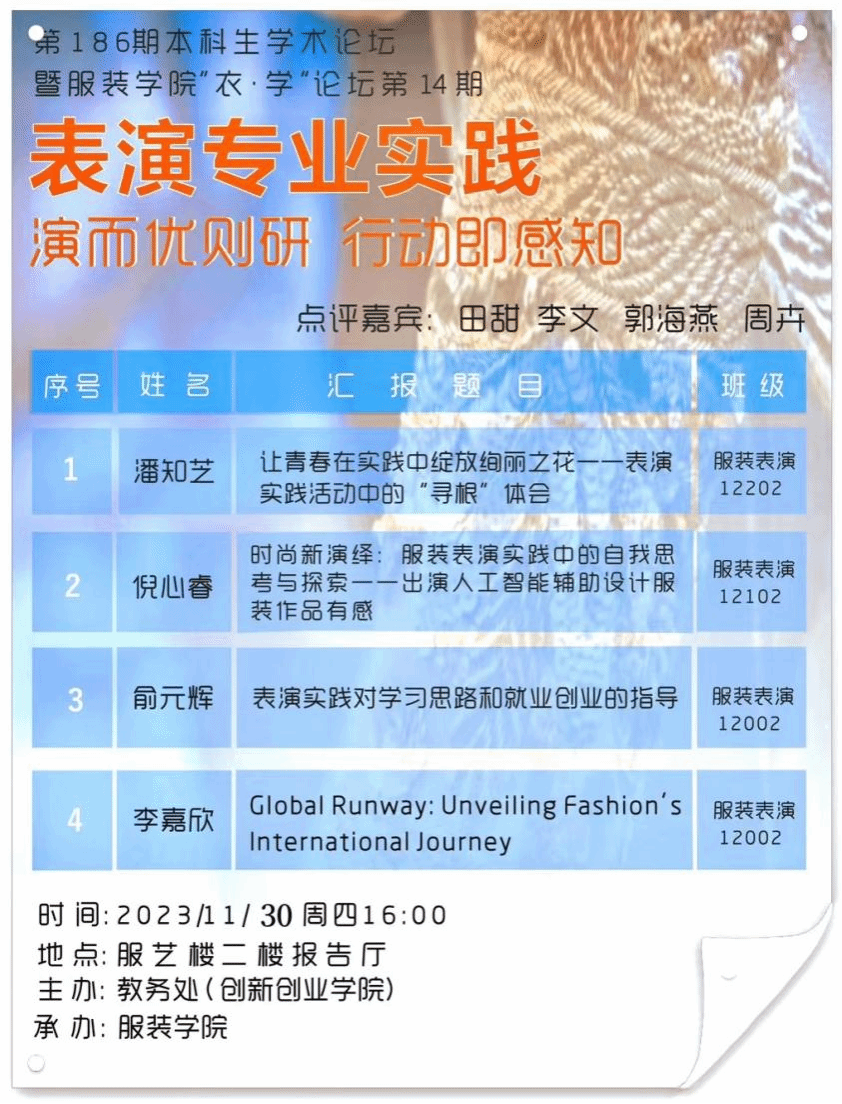 第14期“衣.学”本科生论坛于11月30日举行,此次主题为《表演专业实践:演而优则研,行动即感知》。由表演系副主任田甜与李文共同策划,邀请了郭海燕副教授、周卉副教授、担任点评嘉宾,李文老师主持。