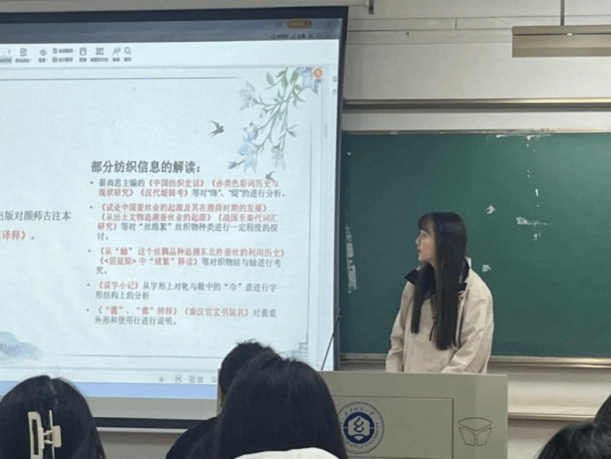 最后一位分享人胡晓涵同学分析了《急就篇》中的纺织句章,文章通过基于对各代的相关解读,进行文献考据和文物实证相结合的二维互证法复盘研究。她认为“绛”是与纺织有高度相关的间色,来源于植物“染绛草”,呈深红色,具有特殊地位的人才可使用。“綢”与“絓”都是粗丝, “綢”来自于柞蚕丝,属于东北特色茧丝,丝线粗大,“絓”则是采用蚕丝中的“废蚕”加工而成。“囊”与“橐”都指袋子,“囊”是一端开口装物后系扎,有方底和圆底两种样式;“橐”为两端开口装物,常在长途、运输、载货中使用,在官场上“囊橐”在外加封检作为传递文书的重要工具,由青、皂、赤白不同颜色表示文书的紧急程度及分类。