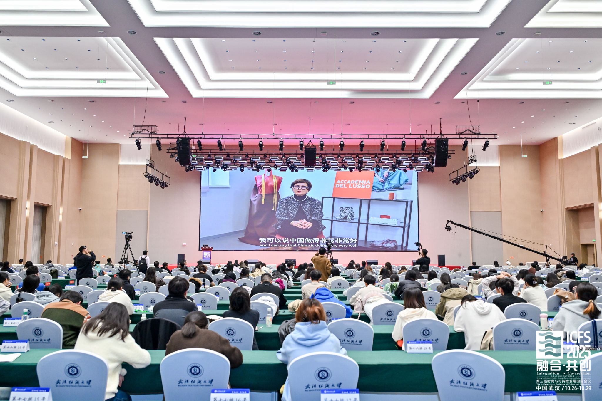 2025年10月27日上午,以“融合·共创:科技与文化助力时尚可持续发展”为主题的第三届时尚与可持续发展国际会议在武汉纺织大学建全会堂盛大开幕。本届国际会议汇聚了来自中国、意大利、英国、日本、希腊、孟加拉国、葡萄牙等国的十余位顶尖学者与产业先锋,共同探讨科技如何重塑设计、生产与教育。主旨论坛围绕“材料创新”、“智能穿戴”、“数字孪生”、“可持续设计”及“跨文化教育”等核心议题,分享前沿洞察,勾勒未来时尚新图景。此次国际会议开幕式由体育博彩(中国)官方网站 院长陶辉教授主持,600余人参加开幕式和主旨论坛。