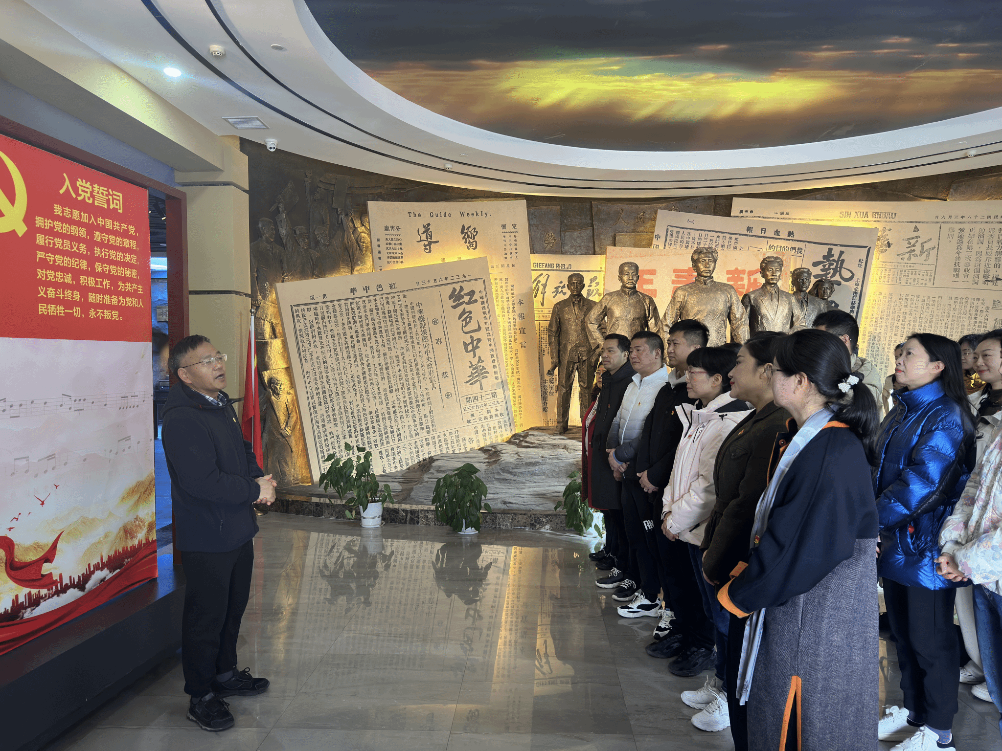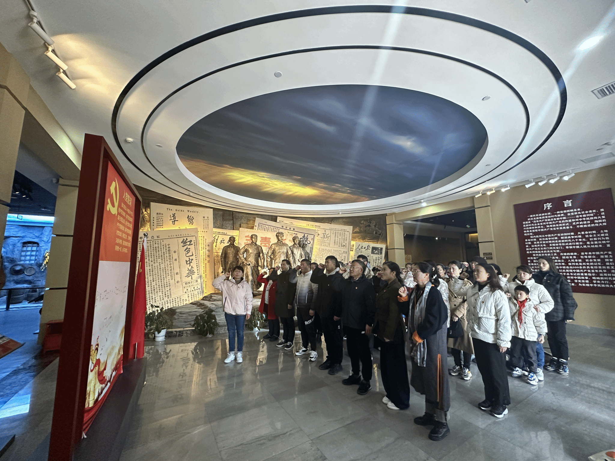 武汉龙源红色报刊博物馆运用声光电、多媒体、场景复原、体验互动等多种形式,全面展示中国共产党百年奋斗的光辉历程和辉煌成就,生动诠释“没有共产党就没有新中国”,大力弘扬中国共产党的伟大建党精神。当气势恢宏的博物馆呈现在眼前时,观展的人员都被深深震撼。在讲解员的带领下,大家进一步体会到中国共产党一路走来的艰辛和伟大。