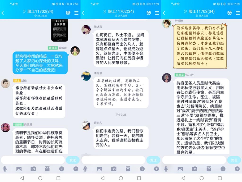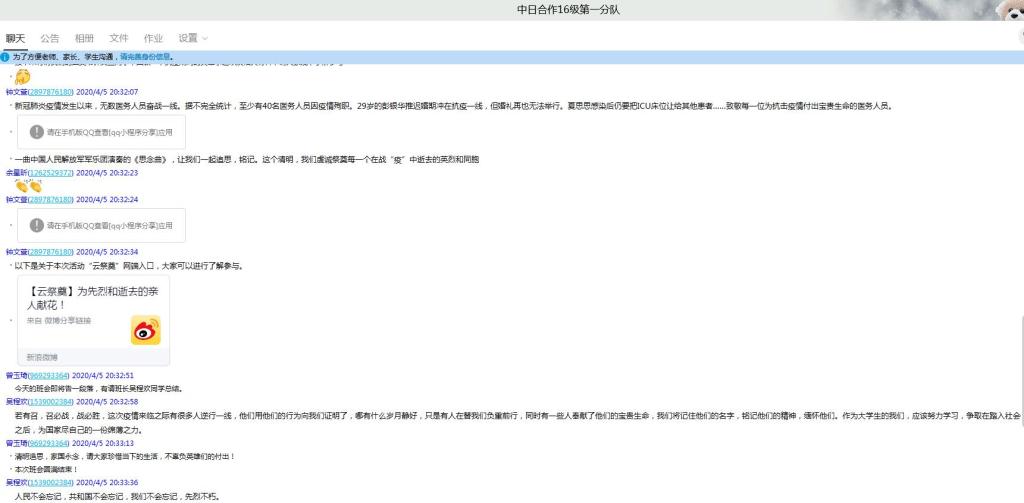 各年级辅导员老师积极谋划、组织开展主题为“缅怀先烈、致敬抗疫英雄”的云班会,通过线上观看清明节默哀视频、学习了解湖北14名新冠肺炎疫情防控一线牺牲烈士的光荣不朽事迹,缅怀先烈,向抗疫人员致敬。