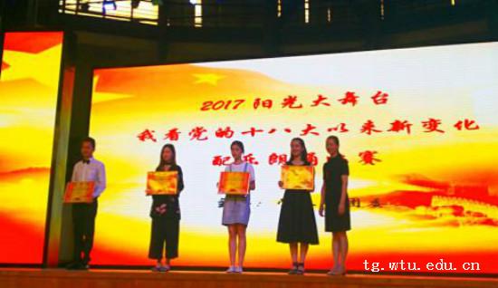 5月24日,武汉纺织大学阳光校区举办了2017阳光大舞台“我看党的十八大以来新变化”配乐诗歌朗诵大赛,经过激烈的角逐和评委的公正评审,我院最终荣获二等奖。