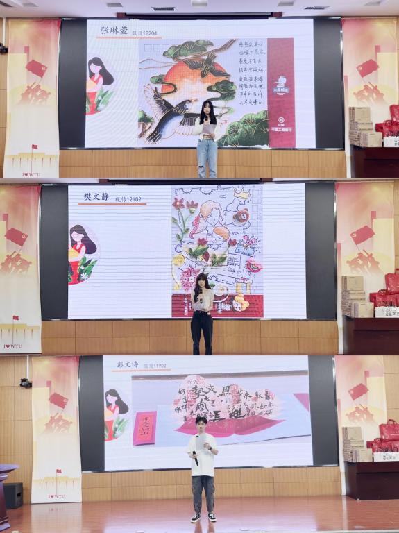 一等奖获得者张琳萱、彭文涛和二等奖获得者樊文静作为获奖学生代表,分别分享了自己的创意和想法、创作心得、以及和母亲的故事。