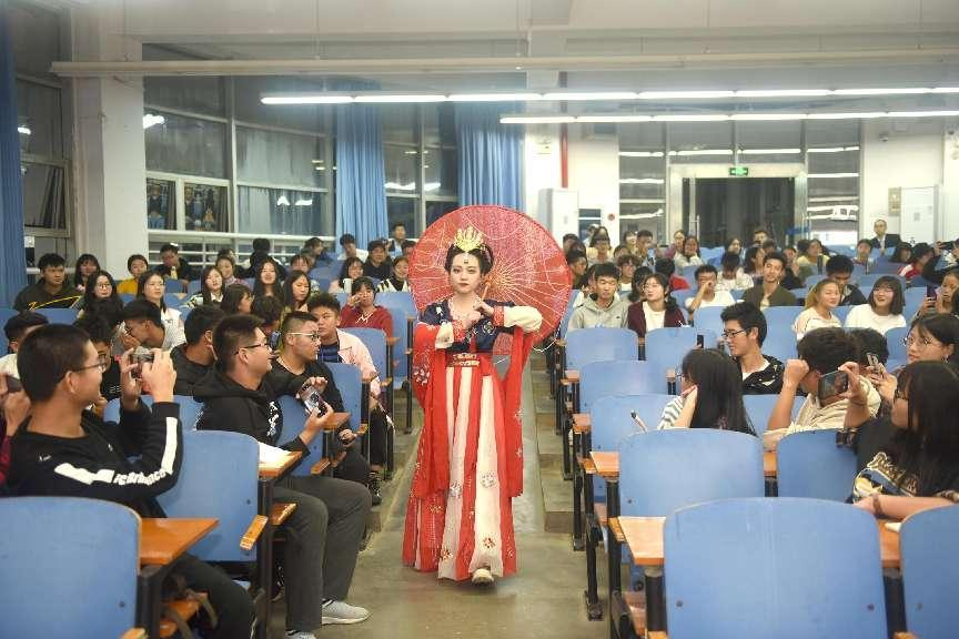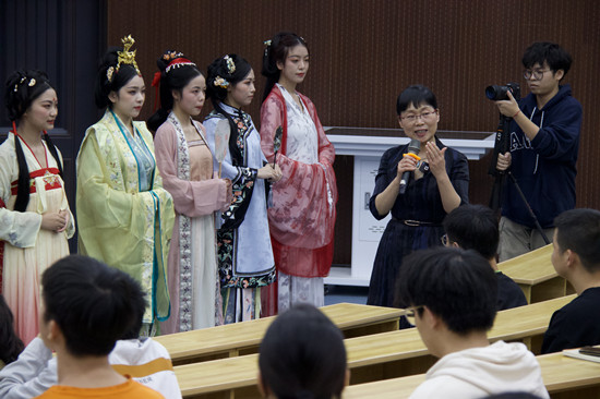 参加课堂展演的研究生同学穿上各时代的传统服饰、梳妆上与之相匹配的发式和妆容进行展示,并根据课堂内容的进度现场演绎传统礼仪,随着陶教授课程内容的深入,让现场的同学们仿佛穿越了时光,感受泱泱华夏文明的发展脉络。