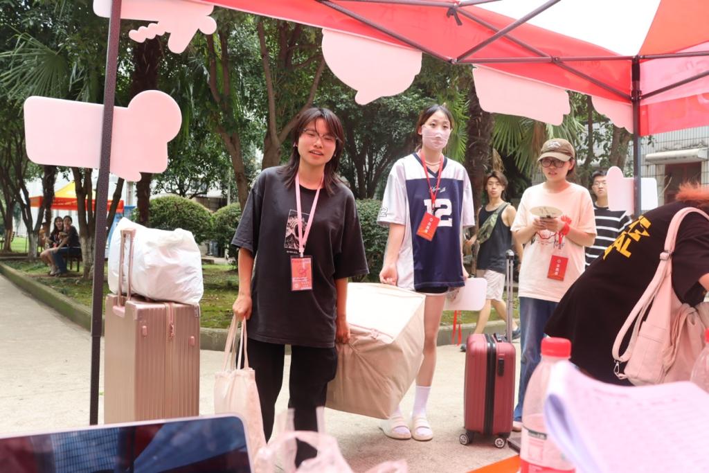 牌子迎接新生;在迎新点,志愿者们为新生发放礼包并完成报到手续;在宿舍楼下,志愿者事无巨细的为新生和家长们讲解办理手续和入住注意事项;在穿行的人行中,志愿者们肩扛手拎新生的行李,成为一道靓丽的风景线。