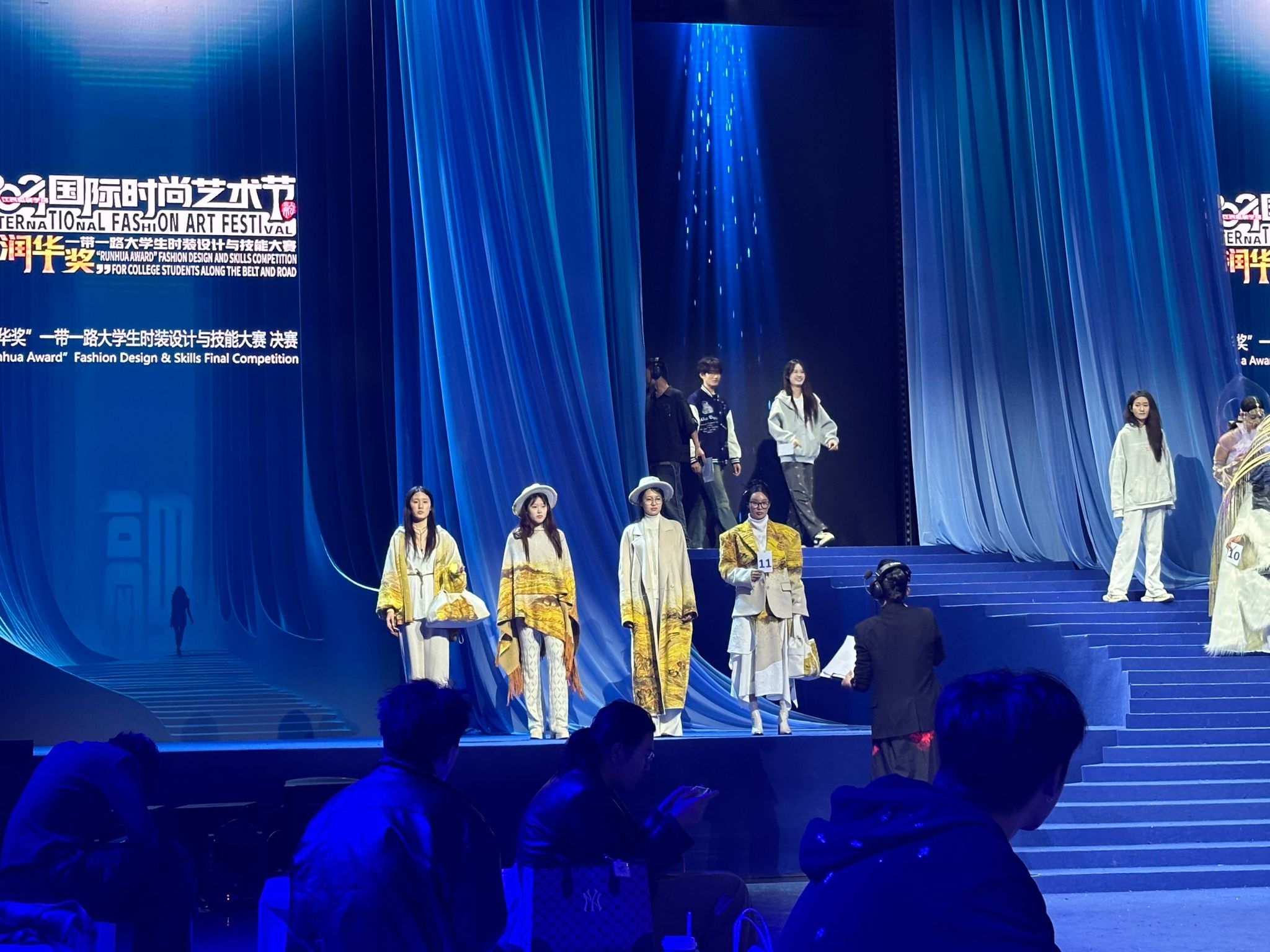 2024“润华奖”一带一路大学生时装设计与技能大赛入围决赛的选手经过立裁、制版、工艺制作等综合技能考试和现场答辩环节考核,11月2日上午,在模特的精心演绎与选手的视频回放下,选手的设计思路与参赛心路历程被逐一呈现。