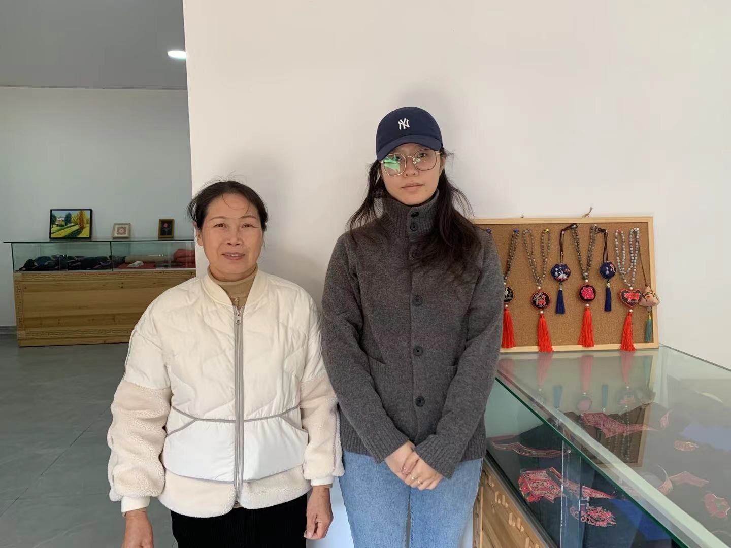 图为苏薇与黄冈蓝靛印染传承人陈小莲学习
