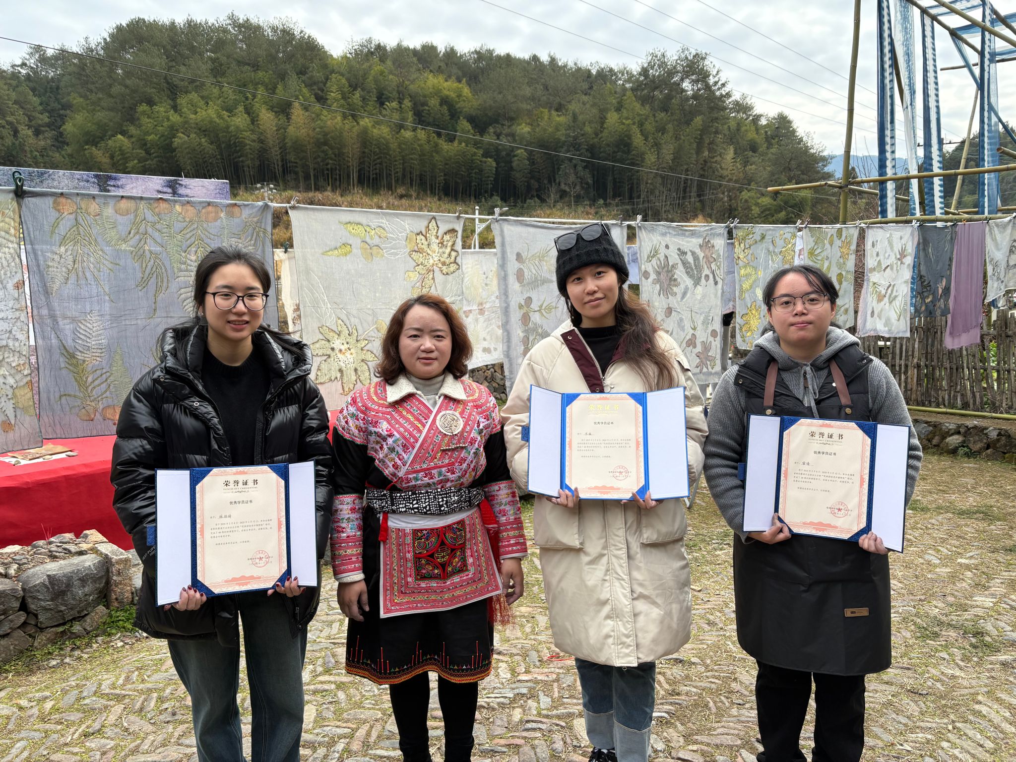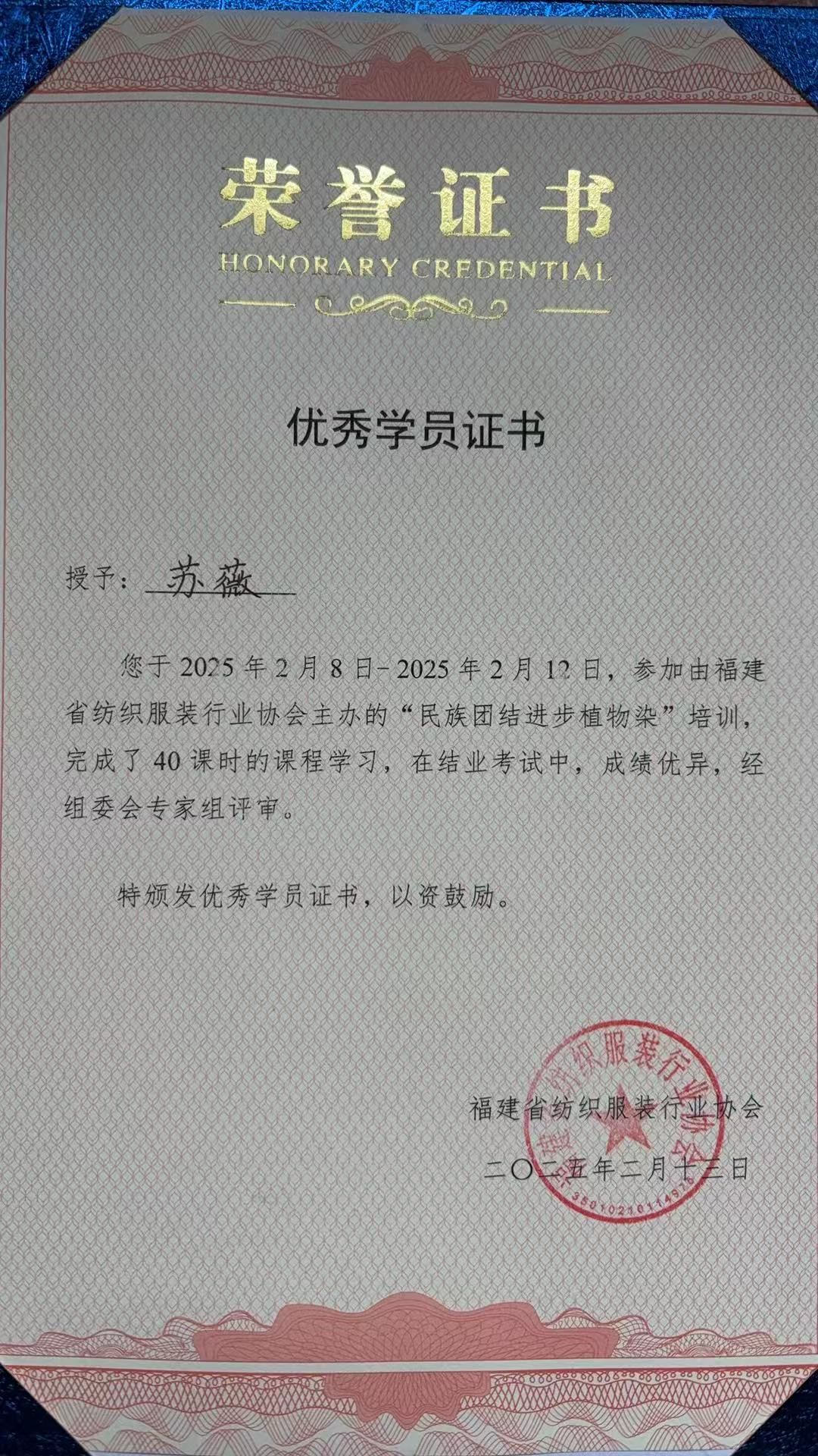 2025年2月8日-----2月12日,由福建省女科技工作者协会、福建省纺织服装行业协会、中国纺织工程学会科普基地联合主办的首届植物染文化艺术活动在福建省闽侯县廷坪乡塘里村盛大开幕。活动以"传承与创新"为主题,聚焦植物染技艺的现代化发展与乡村振兴,吸引了全国非遗传承人、高校师生及行业专家百余人参与。我校中国体育博彩 研究生苏薇,作为武汉染语非物质文化传播有限公司总经理,利用寒假返乡研学机会参加并荣获“优秀学员称号”。