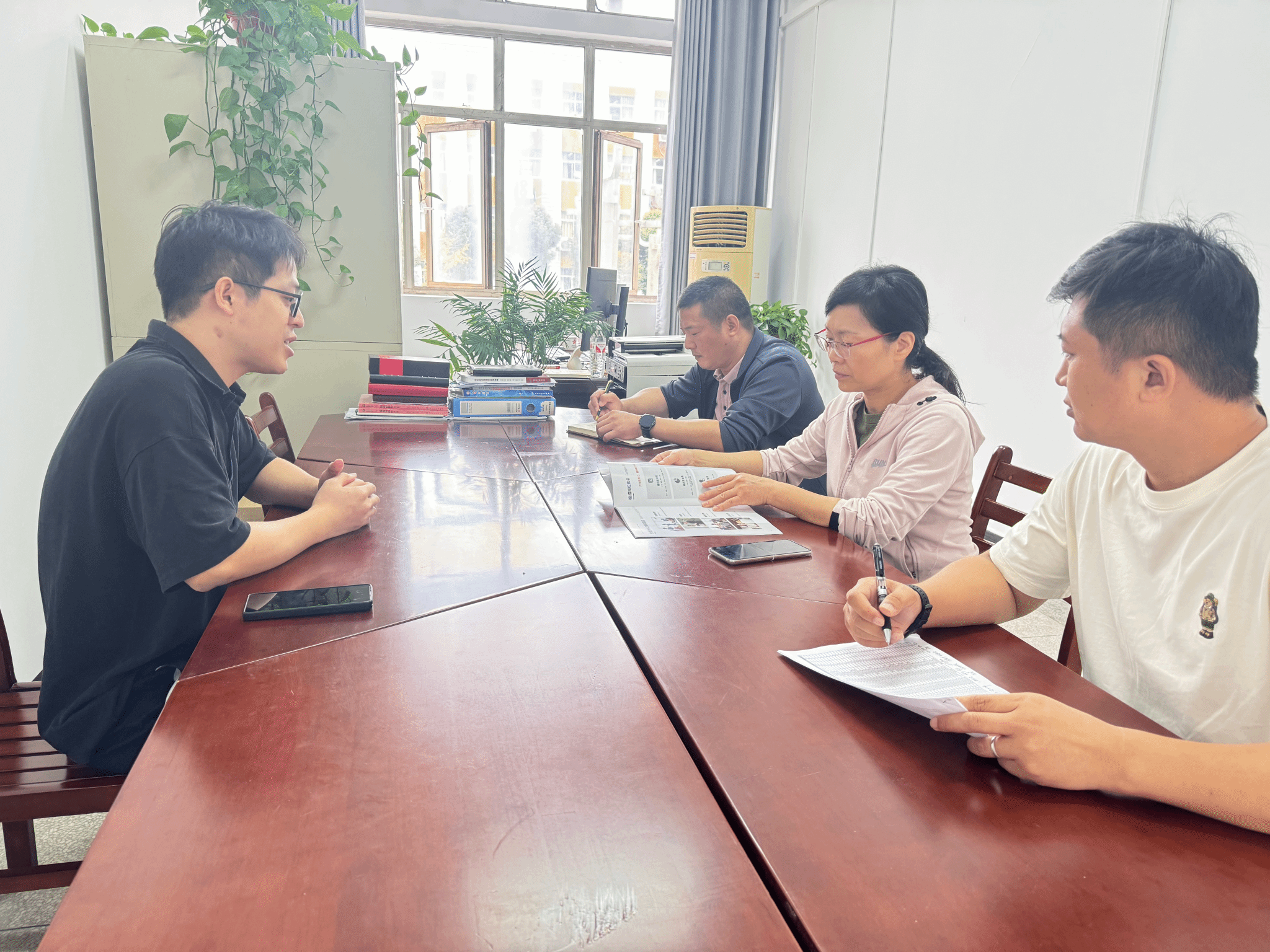 领导班子与公司人资负责人吴志强交流访企拓岗促就业工作。