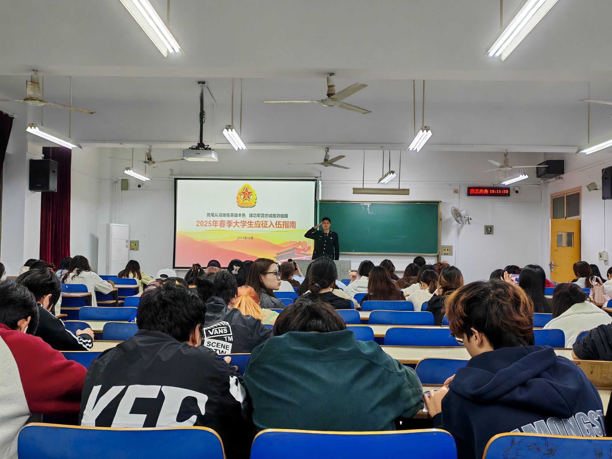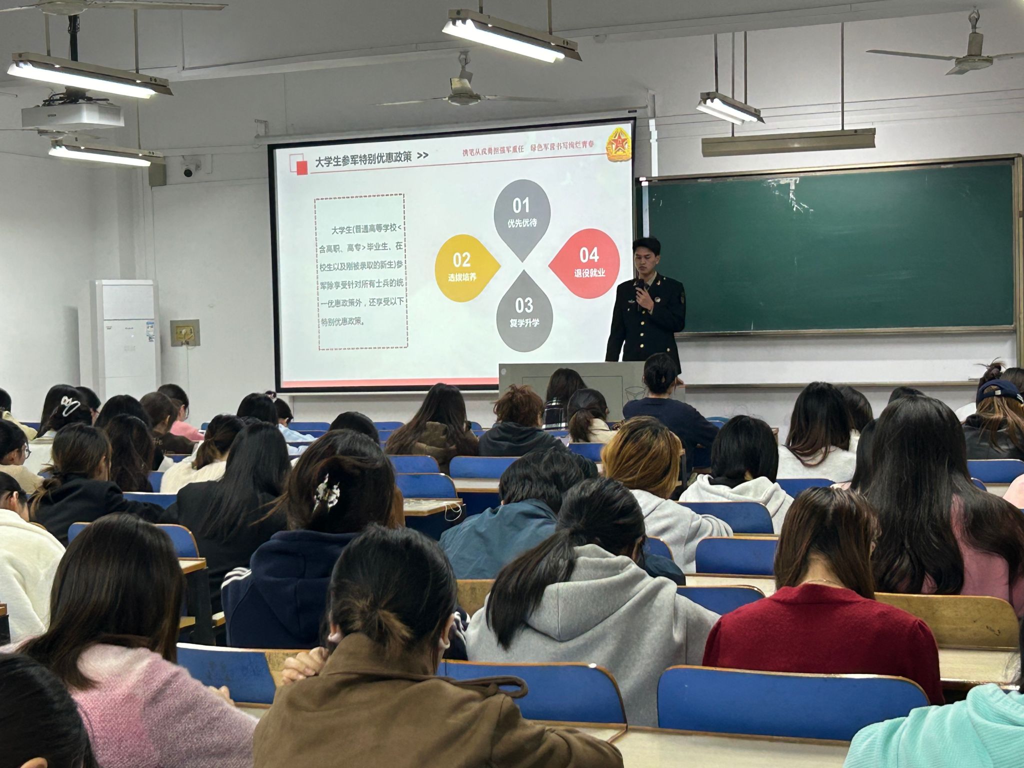 退役待遇以及应征入伍优势这五个方面的内容,他热切呼吁同学们踊跃响应祖国的召唤,亲身去感受军营的独特魅力,努力去实现个人的价值,为自己的青春增添一抹别样绚丽的色彩。
