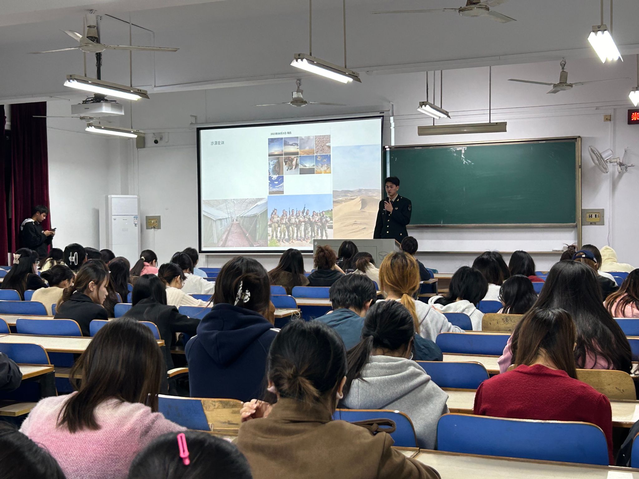 11月10日在5308教室举行退役士兵交流活动暨征兵宣传大会。退役士兵程万里受邀宣讲,2022级服工专业同学参加活动。
