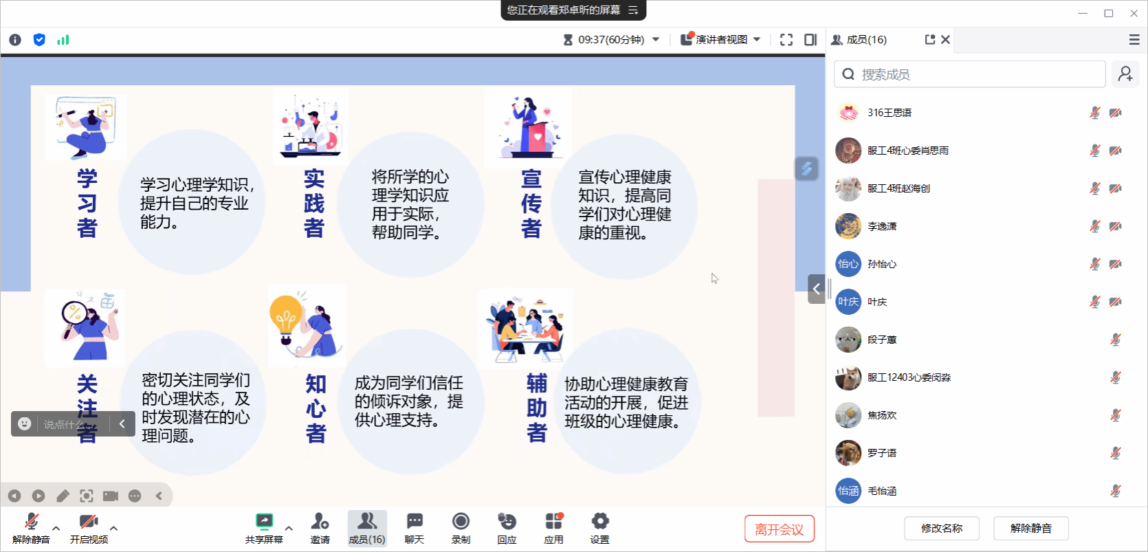 本次会议主要围绕心理委员展开讨论。新生踏入校园之际,往往会被迷茫、焦虑乃至抑郁等不良心理状况所困扰。在此情形下,心理委员的重要性便得以凸显,其肩负着为同学们排忧解难、疏导心理问题以及缓解压力的重任。无论是心理委员,还是依心小屋的成员,都理应积极主动地投入到解决这些心理问题的工作当中,通过温暖关怀,为同学们营造一个健康、和谐、积极向上的心理环境,助力他们顺利度过新生适应期,开启美好的校园生活篇章。