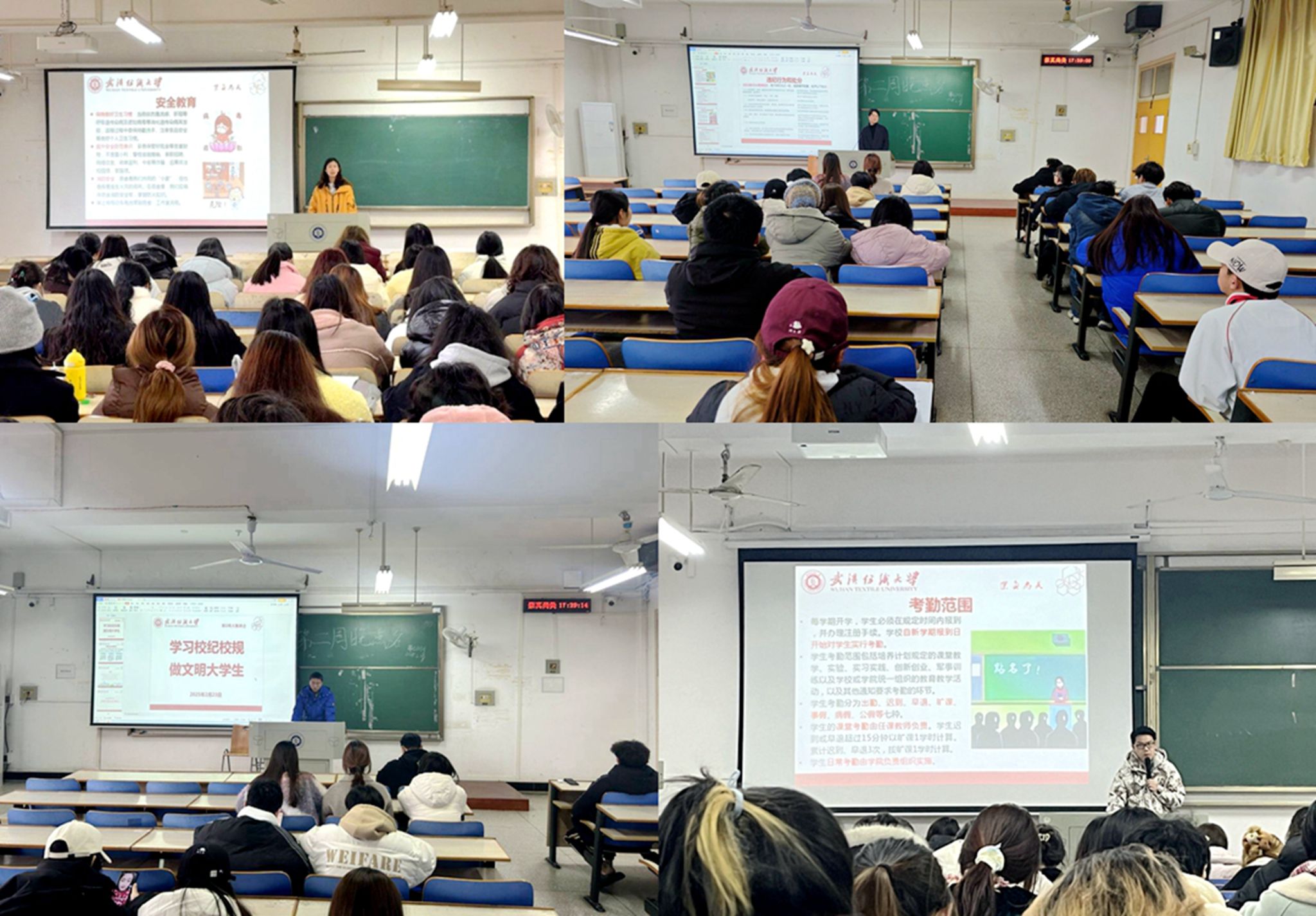 全体辅导员、班主任以主题班会的形式深入各班组织召开“学习校纪校规,做文明大学生”主题班会,主要涉及《武汉纺织大学本科生考勤及请假管理办法》、《武汉纺织大学学生违纪处分办法》、《武汉纺织大学学生申诉处理办法》、《武汉纺织大学本科生勤工助学管理办法》等相关制度内容的学习。