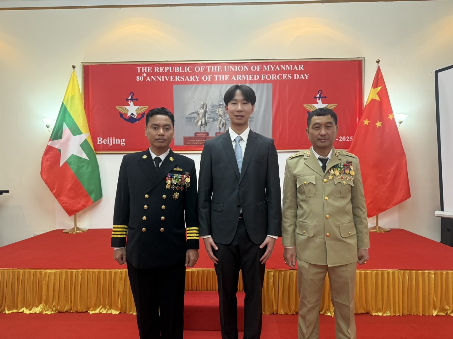 学子、学生社团"声色纺大"诵读协会学生负责人孙印航在京参加了缅甸大使馆(北京)建军节80周年庆典活动。作为全场唯一受邀的大学生代表,孙印航在活动中充分展现了中国青年的风采,并见证了中缅两国深厚的传统友谊。