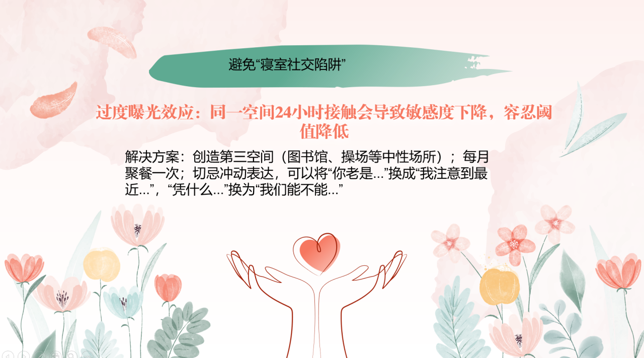 最后,针对同学们最熟悉的宿舍生活,提出了一些实用建议。长期密集地相处很容易引发矛盾,尤其是一些小摩擦如果不及时沟通,很容易影响关系。可以通过创造“第三空间”,比如去公共自习室、休息区等,适当调整彼此接触的频率,让关系更有呼吸感,既保持联系,又能避免“过度亲密”的烦恼。