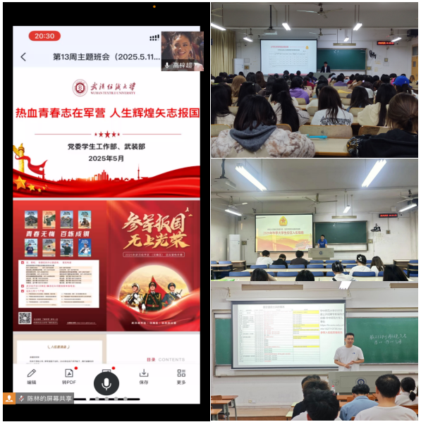 继3月、4月相关活动之后,继续开展活动推进征兵宣传“三个一”工作。5月11日,全体辅导员、班主任开展了“热血青春志在军营 人生辉煌矢志报国”主题班会,并邀请退役士兵做朋辈领航交流活动。