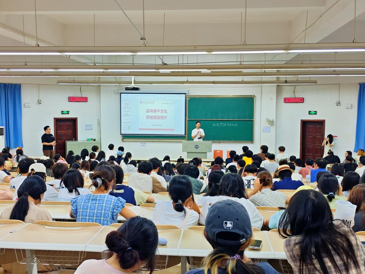 在端午节假期前夕,熊老师向同学们讲解了端午节的起源意义以及端午习俗,探讨屈原事迹,剖析屈原“路漫漫其修远兮,吾将上下而求索”的爱国情怀与理想追求。端午节的底色正是爱国情怀的最好诠释,作为新时代的青年学子,我们要感受习近平总书记的家国情怀,凝聚奋进前行的无穷力量,不懈奋斗,建功新时代。讲解端午节背后的故事有助于同学培养以爱国主义为核心的意识,激励我们在日后的学习生活中继续奋斗。