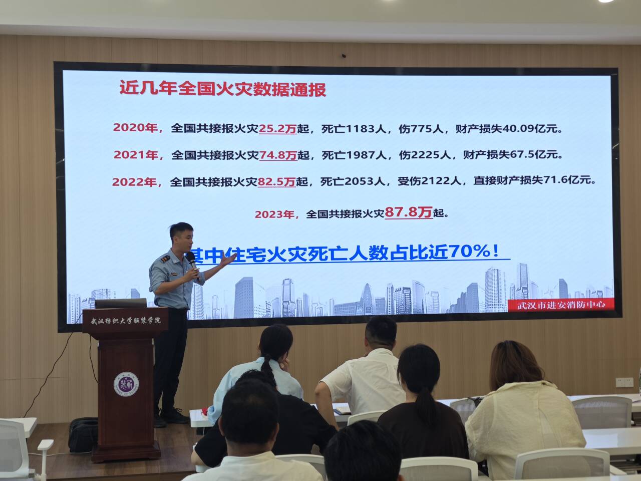 尹亮教员结合触目惊心的现实案例与权威数据,为教师们敲响了警钟。课件展示的全国火灾通报数据,尤为震撼:近四年火灾起数从25.2万攀升至87.8万,2022年直接损失高达71.6亿元,而住宅火灾死亡人数占比竟近70%!这些数字清晰揭示了火灾风险的普遍性与残酷性,凸显了提升校园——这一师生“第二家园”消防能力的极端紧迫性。