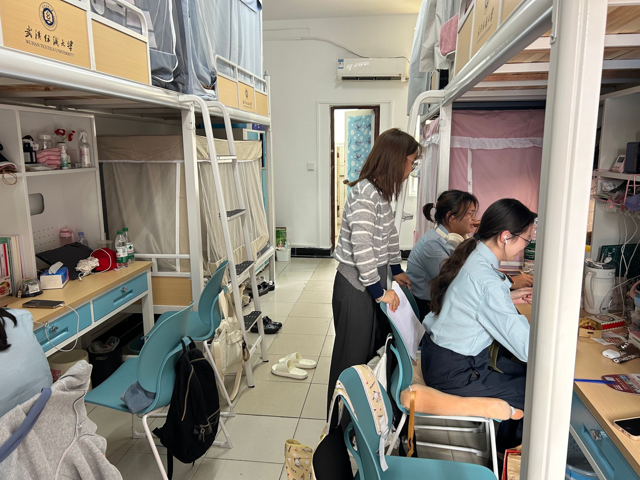 在检查过程中,各年级表现良好,积极配合。本科和研究生25级、24级宿舍表现尤为突出,多数宿舍地面干净无杂物,被褥叠放整齐,生活用品摆放井然有序,部分宿舍还通过绿植、励志标语、手工作品等装饰营造出温馨奋进的文化氛围,涌现出多个优秀寝室,获得检查小组一致认可。高年级宿舍亦可圈可点,整体卫生与秩序保持良好,文化氛围浓厚。但也发现少量宿舍存在问题,个别寝室烟头散落、违规饲养宠物、垃圾乱扔等现象,检查人员已当场明确整改要求与时限,后续将由辅导员跟进整改落实。