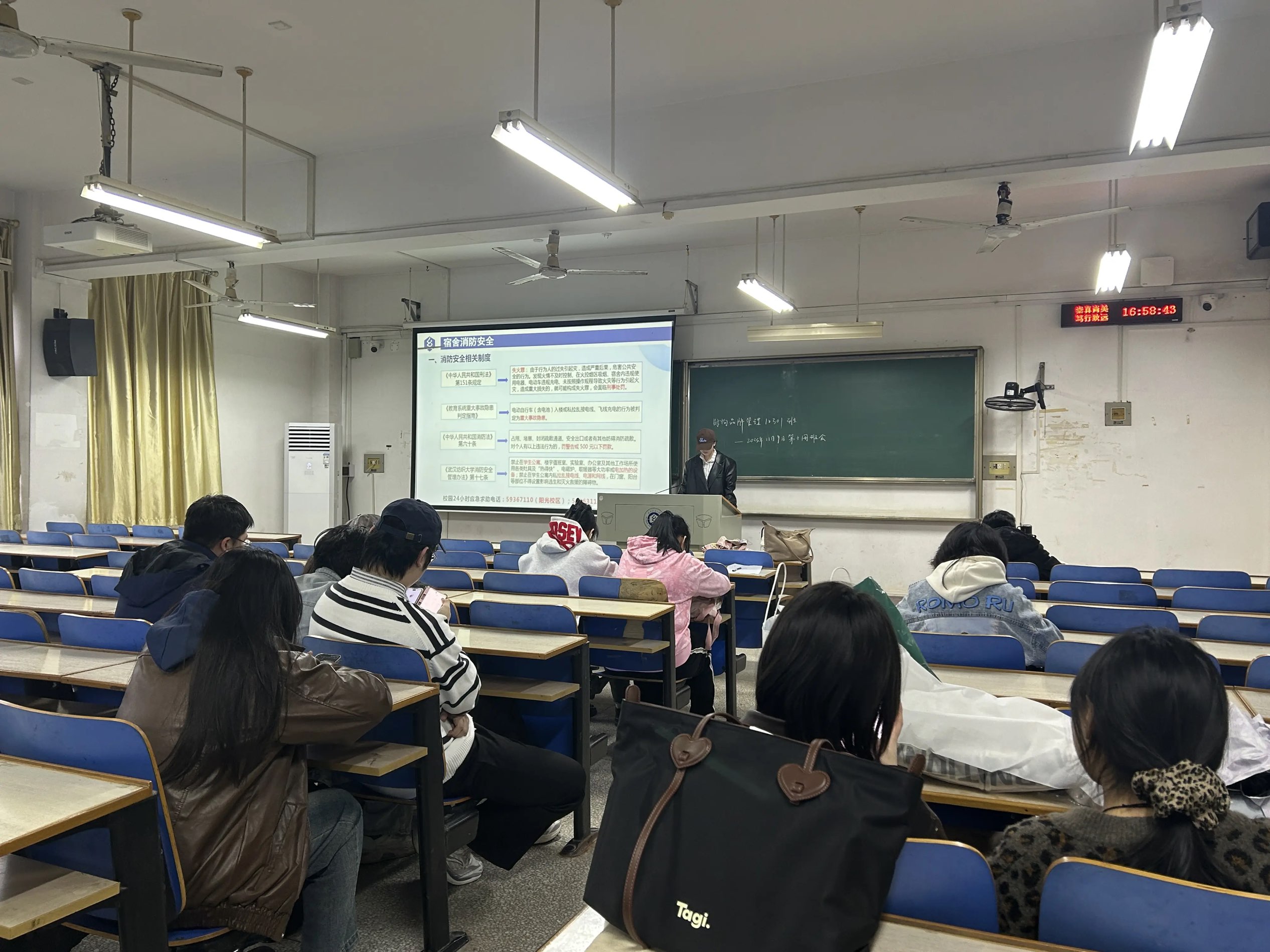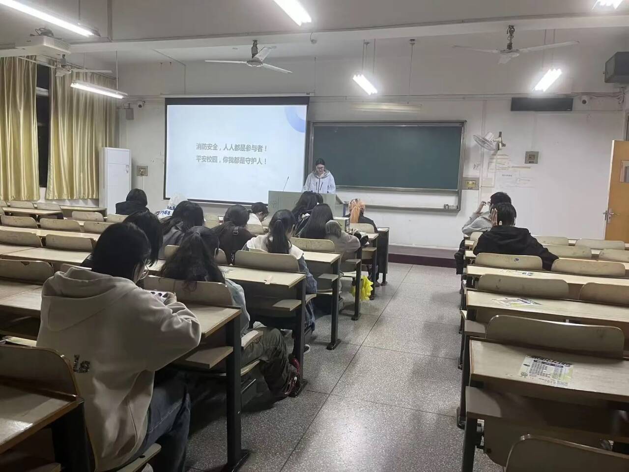 本周晚班会聚焦消防安全教育,各班通过专题讲解、案例剖析、互动交流等形式,组织学生系统学习消防安全相关法律法规,结合阳光校区一寝室火灾真实警示案例,深入分析火灾成因与危害,引导学生深刻汲取教训;同时,细致解读宿舍消防安全“十戒”具体要求,明确禁止使用大功率电器、私拉乱接电线等红线。各年级也具体通报了10月份院公检不合格寝室,辅导员、班主任现场重申整改标准,督促寝室长牵头对照宿舍管理细则逐项自查自纠,确保当日整改到位。