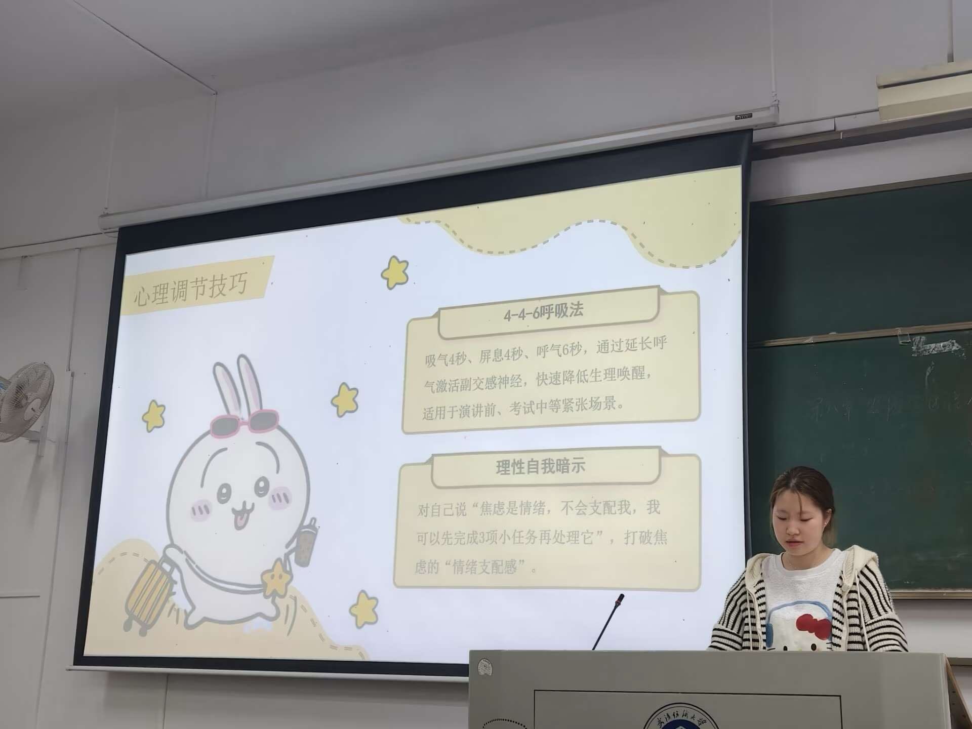 在焦虑根源剖析环节,主讲人从心理因素与环境压力两方面展开说明。应对策略上,分享了4-4-6 呼吸法、理性自我暗示等心理调节技巧,以及每天30分钟运动、规律作息等行为改善方法。