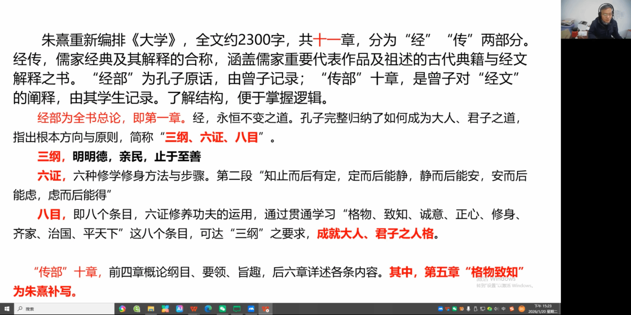 党委书记杜新年围绕《大学》“三纲”“六证”“八目”内涵展开授课,将“修身、齐家、治国、平天下”的儒家理想与当代青年成长相结合,引导学子在经典中汲取修身立德的智慧。