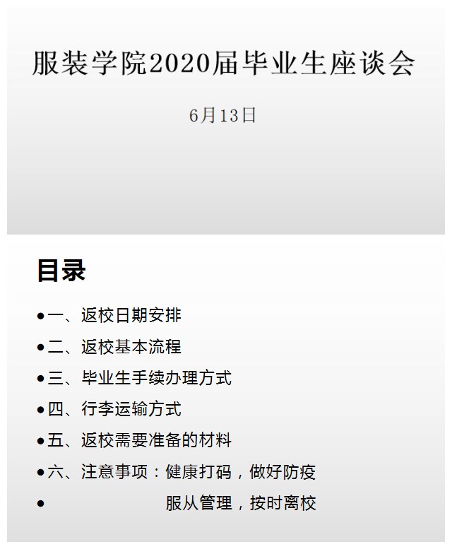 的关心和重视,对返校的流程、返校过程中可能遇到的问题进行了说明,并对于班干部同学的信息传达工作提出要求。随后,张老师重点针对同学们比较关注的返校日期安排、毕业生手续办理方式、行李运输方式、返校需要准备的材料等做了详细解释。最后,对于同学们提出的疑问进行了耐心解答。