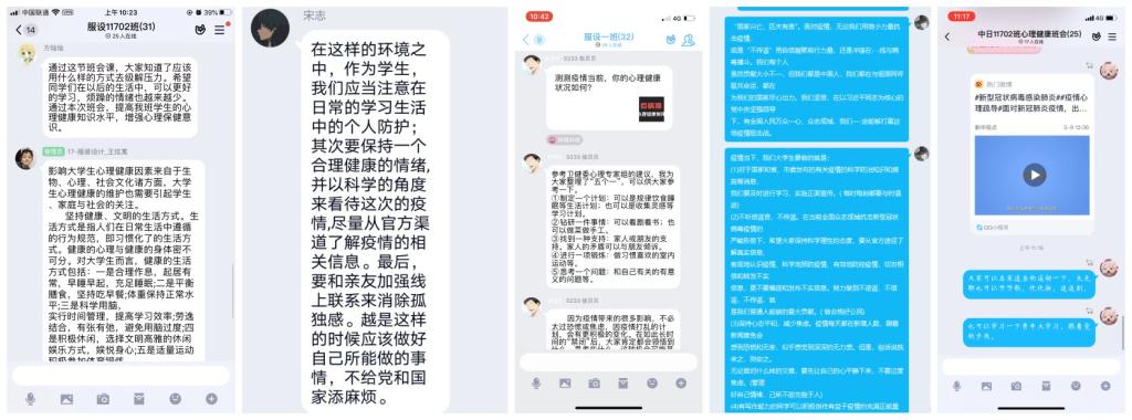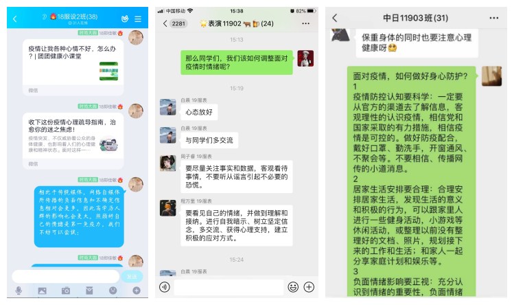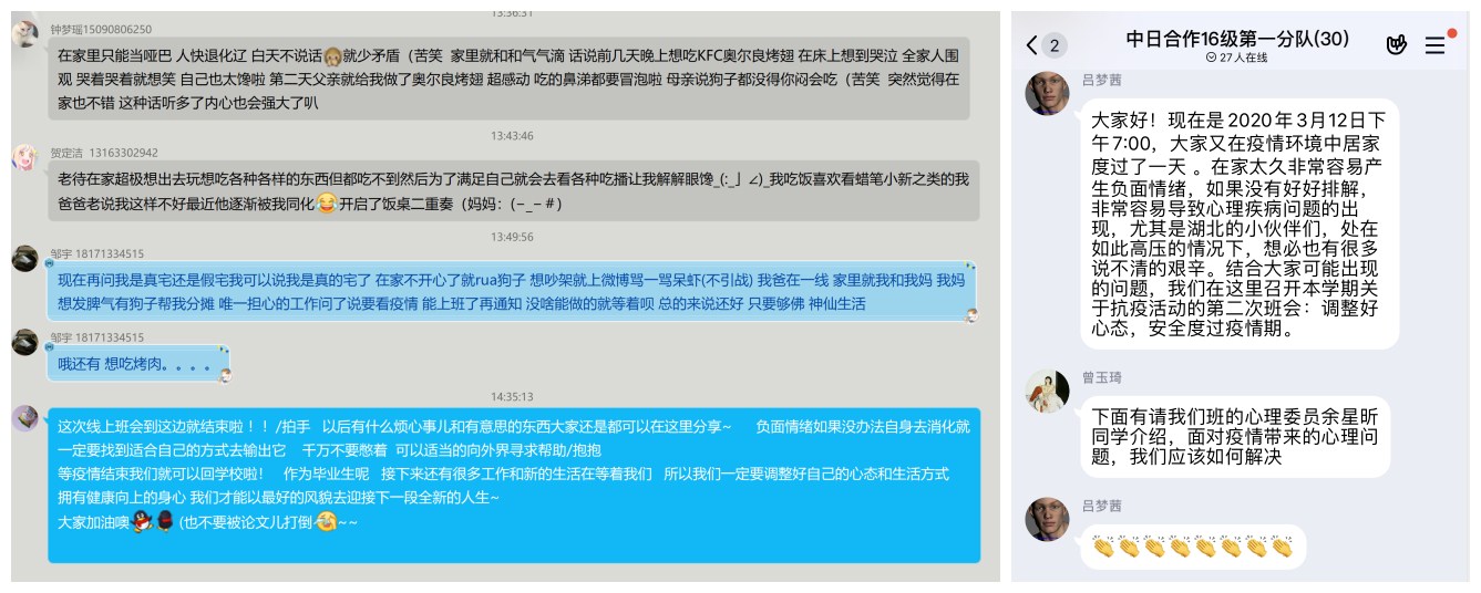 线上班会由各班班长和心理委员组织。同学们在线上观看学习有关心理防疫视频;分享自己在疫情期间的种种经历、感悟和体会;讨论如何应对因疫情而产生的恐慌、压力等情绪;以及如何在家做好学习规划。毕业生们在班会中也相互鼓励,表示在当前特殊的就业环境下,要调整心态,转变就业观念,抓住就业机会。