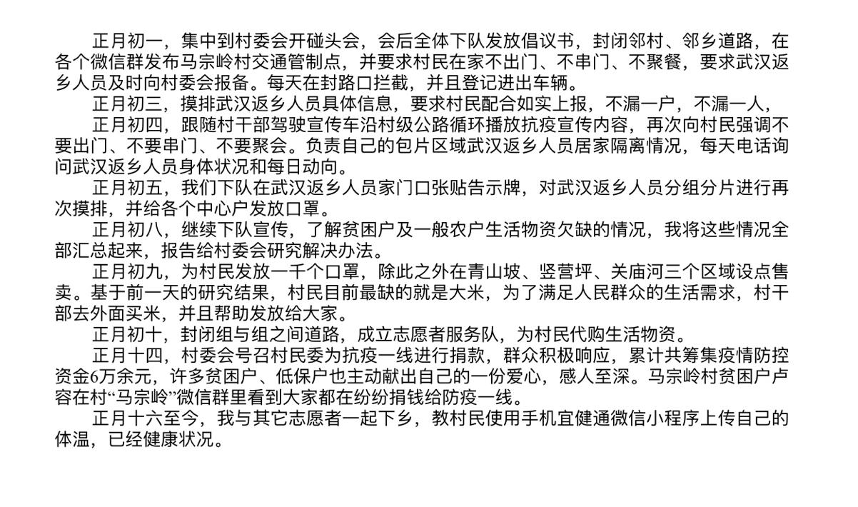 “由于社区人口众多,所以填写与发放出行证这个工作量非常大,社区就是招募志愿者来做这些事情,在亲身参与之后才发现我们湖北黄石的防疫工作真的做得很棒,社区现在只要一了解到有疑似病例的患者救会立马安排车去接,还会安排密切接触者去宾馆隔离,而密切接触者的家属会统一由穿防护服的书记来发就不用志愿者来发,所以说政府的工作人员对志愿者很关怀,我相信政府相信国家,希望患者能早日恢复健康。”