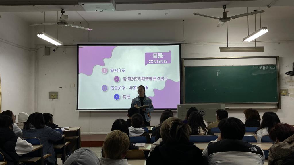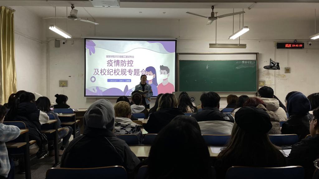 会议开始,卫老师表示我院疫情防控正处于关键时期,希望各位参会同学重视疫情的严峻性,她进一步强调当前疫情防控的近期管理要点:请假必须严格程序,武汉市回家出校返校必须发消息给老师报备;每日畅行码打卡保证真实,一旦发现代他人打卡,两人同责受处分;上报排查数据务必准确,确保无遗漏;个人电话时刻保证畅通,最好每人给家人留1-2个同学紧急联系人;以及不遵守疫情防控规定的后果。