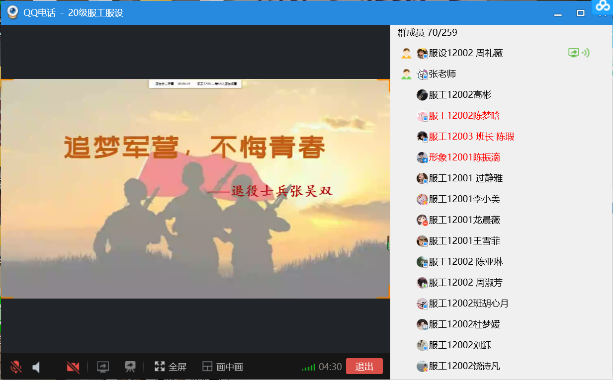 携笔从戎展现青春本色,参军报国不负美好韶华。古有班超弃笔投戎,近代有五四爱国运动,今有参军入伍好征途。每个青年人都有保卫祖国的责任,为了营造参军入伍报效祖国的爱国氛围,2019级退役士兵张吴双同志受邀在5月8日晚上20:00为20级的学弟学妹们线上开展了“追梦军营,不悔青春”的主题分享活动。