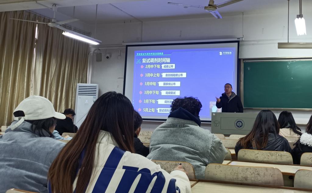 举办考研复试调剂指导答疑课。本次答疑课邀请万学教育海文考研湖北分校校长谭晓禹老师主讲,本次答疑课还同步进行了线上直播。