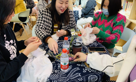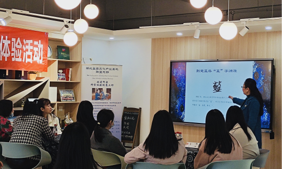 活动内容共分为三大板块。首先,蓝染独秀表演。郭海燕副教授的蓝染服饰主题独秀表演,伴随着一曲中式风格温婉的音乐,淋漓尽致地表现出中国传统蓝染印花面料的古朴风韵,引起了现场阵阵掌声。其次,蓝染文化传播。王妮副教授讲解千年楚蓝历史娓娓道来,短暂的十分钟带现场体验者穿越千年,探寻楚国的“蓝”。随后她表示,湖北地区有着千年的染蓝历史,在荆楚传统纺织服装面料染色技艺中占有重要的位置。曾经从明代开始,伴随着棉花的广泛种植,民间种蓝、打靛、染布成为具有一定规模的产业,带动了几百家染坊的发展。而如今,随着非遗科普的推广,更多的非遗印染文化与技艺得到复苏,相关文创产品设计水平不断提升,文化产业随之逐步繁荣。最后,蓝染手工体验。所有体验者根据讲解要点实操扎花、染色、晾晒。有一位女企业家赞叹道:“青出于蓝的典故我今天终于亲身感受到了,古老的印染方法亲眼所见,由绿到蓝的变化太神奇了!为我们荆楚蓝染点赞”。