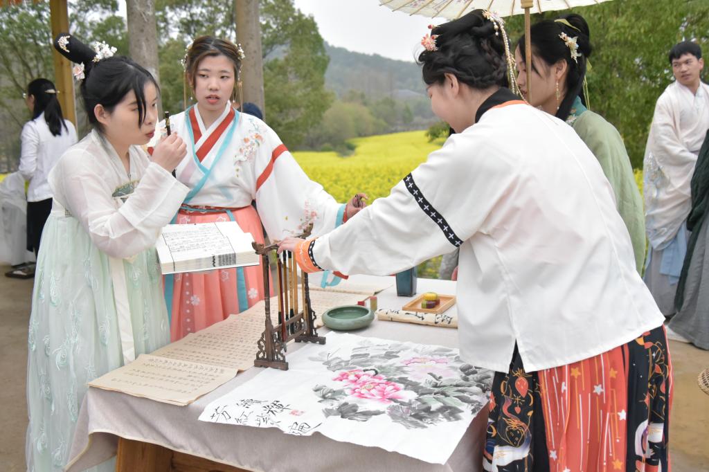 木屋檐下,同学们提笔挥墨;菜花田里,我校同学们就书本内容相互分享交流,表达了学生们对阅读的喜爱,增强了广大青年学子要做新时代的奋进者,做阅读经典的主力军的信心。在走秀结束后,我院刘俊老师执古琴,领唱悠扬歌曲,全体学子感受到传统文化的独特魅力,以及奋进未来的豪情壮志。