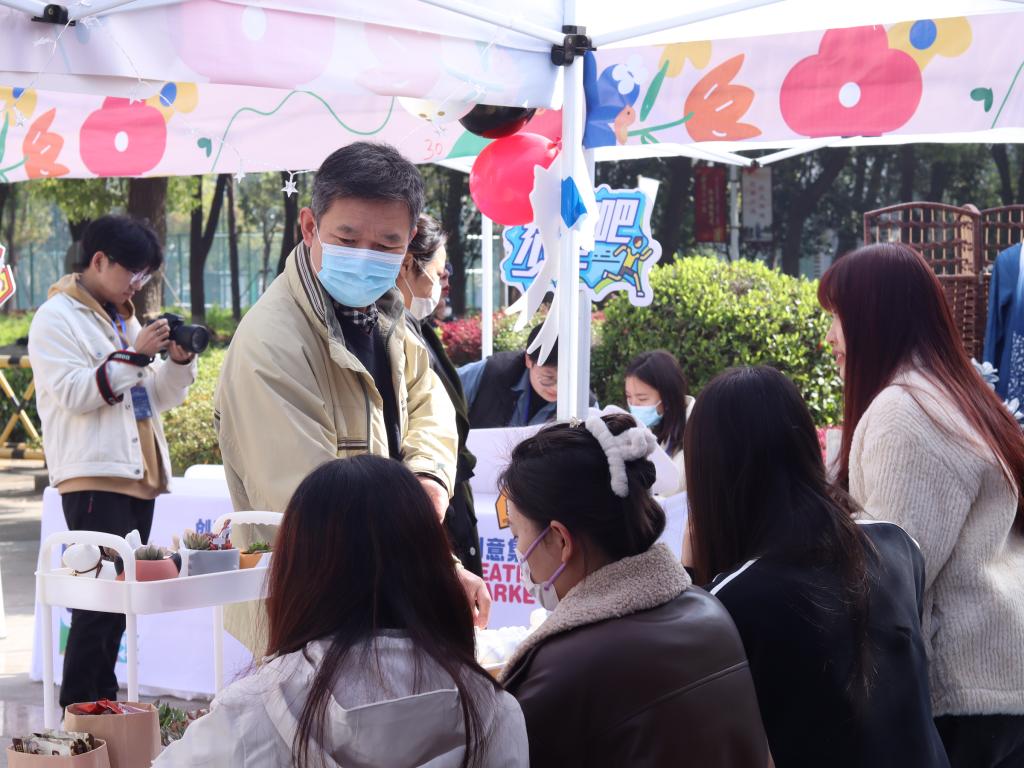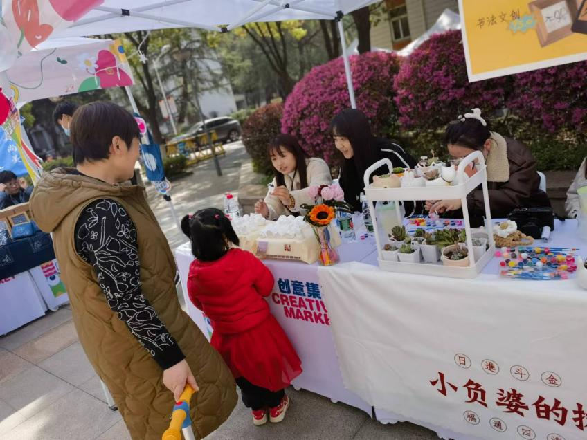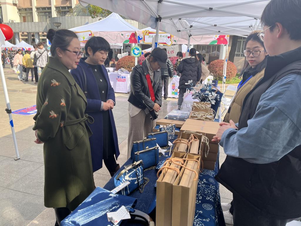 上午9时, 随着一声锣响,热闹的集市正式开始。摊主们热情地向过往人群展示自己的创作成果;学生们纷纷驻足观看,认真挑选自己心仪的创意作品;导师们认真察看摊主们的文创产品,询问各类产品的设计理念、制作工艺等,集市气氛热烈。