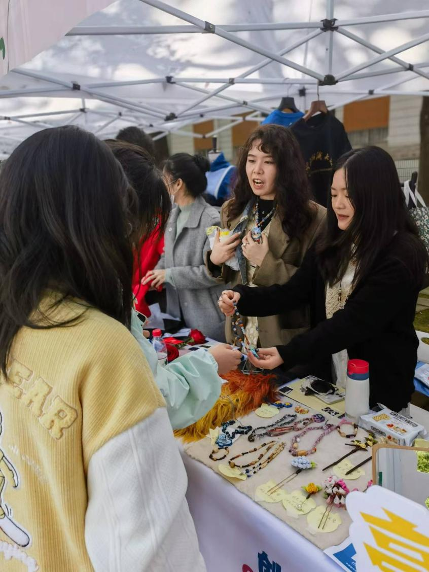 活动现场,各摊位有序排列,琳琅满目的商品整齐摆放。民族发饰、手作玩偶、特色配饰、雕塑作品等均来自学生手工制作,种类丰富多彩,让人眼花缭乱。舞台中央,精彩的舞蹈表演、动感乐器演奏将活动推向高潮。
