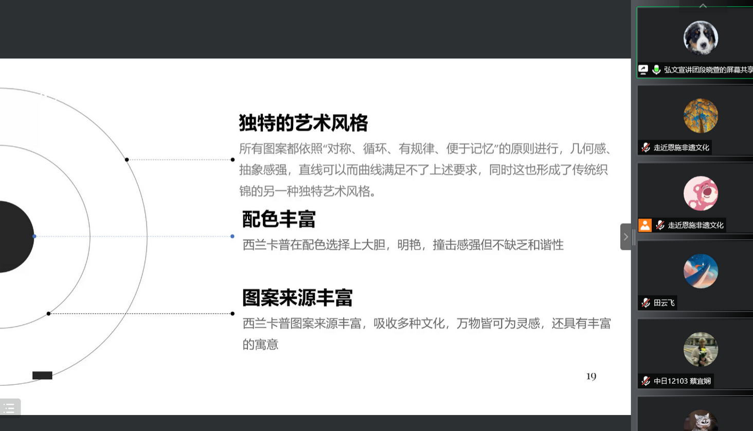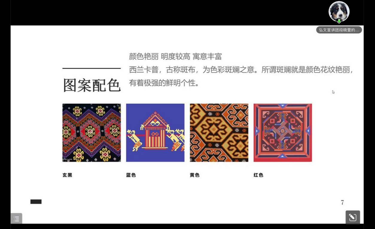 宣讲团成员服设12001班段晓萱同学首先介绍西兰卡普是一种怎样的土家织锦,之后用视频来带大家深入了解恩施非遗文化,对西兰卡普进行详细介绍。具体内容从实际记载文献和一些神话传说介绍了西兰卡普的来源、编制技法,然后围绕西兰卡普纹样分类进行解说,对于经典纹样“四十八勾”做了详细讲解。之后再从西兰卡普的配色选择方面来介绍,从当地的生活景观、一些崇拜方面解释为什么土家族人会选择这些配色,最后是介绍现在的一些西兰卡普在当地的实际生活的运用、产品上的运用和服装上的运用。并提醒大家只有我们充分了解非遗文化发展历程,才能更好地传承优秀传统文化。
