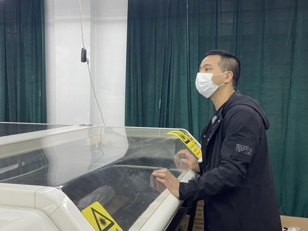 在完成初步的介绍后,吴老师带领大家移步至进行激光雕刻工艺的机器旁边,亲自示范操作激光雕刻工艺技术。在同学们围绕机器聚精会神的观看学习老师操作的同时,老师结合正在工作的机器,指出机器每一个部分的工作流程、通过镜片折射切割工作的原理以及可以进行多材质操作的智能化程序。