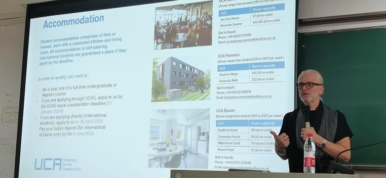 兼任UCA国际招生学术总监的Mr.Neil Bottle首先向同学们展示了他的个人作品。他讲述了在没有数字媒体的时代个人的艺术创作方式方法,同时在向数据时代的转变中,他所做的创作上的调整。还与同学们分享了他的创作灵感以及创作过程中的思考。