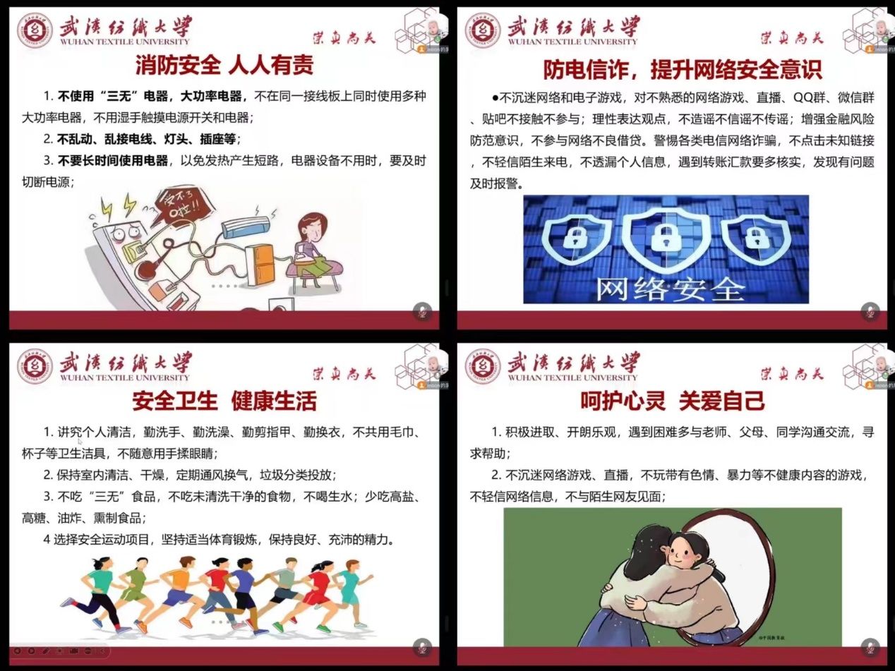 党委副书记、全体辅导员、班主任通过企业微信、腾讯会议、QQ等网络平台,组织全体学生召开了主题为“安全文明牢记心上”的网上班会。