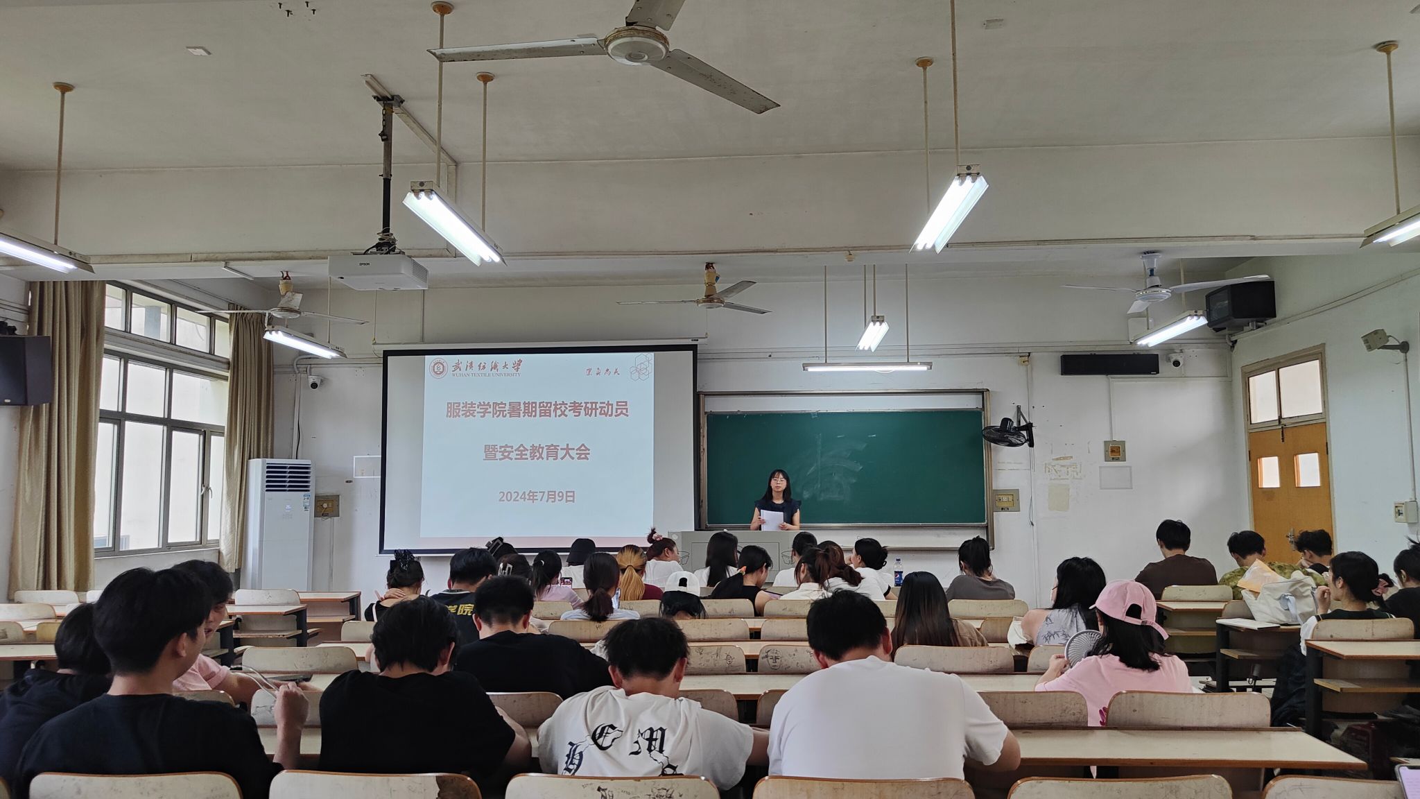 在综合楼210教室召开暑期留校安全教育暨考研动员大会。2025届毕业班辅导员高梓超及全体留校考研学习学生参加本次会议。