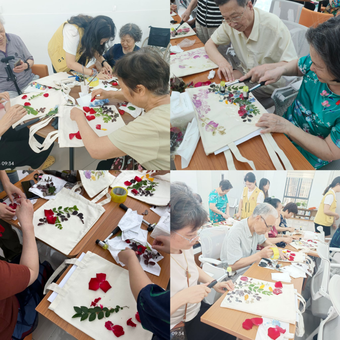 “草色锤染身上衣,映红犹闻彩花香”。“织尚”开设植物拓染课程,让老人们通过实践课程了解植物拓染的基本原理和技巧,以实践动手的形式传承与弘扬非遗文化,更深入地感受大自然的美丽与奥妙,体验艺术创作的乐趣。一花一叶,一块布一把锤,轻轻敲打,将植物拓染于白色帆布袋上,保留植物原始的美,把大自然最简单至纯的色彩留存于布上,赋予作品自然美感。