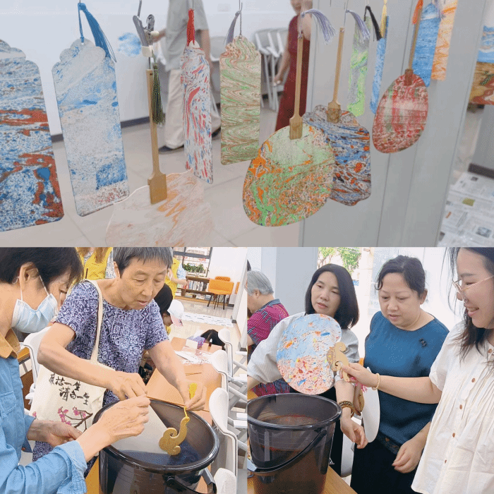 漆扇轻摇,春消夏长。活动现场,志愿者们给老人们讲述了漆扇的概念、种类和制作工艺。在实操环节,每一位参与者获得了一块未经加工的漆扇面,以及一系列用于漂漆工艺的工具和材料,大家充分发挥想象力和创造力进行调色、染色,制作出一把把绚丽多彩、独一无二的漆扇作品。一把把精美的漆扇作品呈现在大家面前,或清新淡雅,或浓墨重彩,老人们手拿自己的作品,笑脸盈盈的互相赞美,现场气氛和谐而热烈。