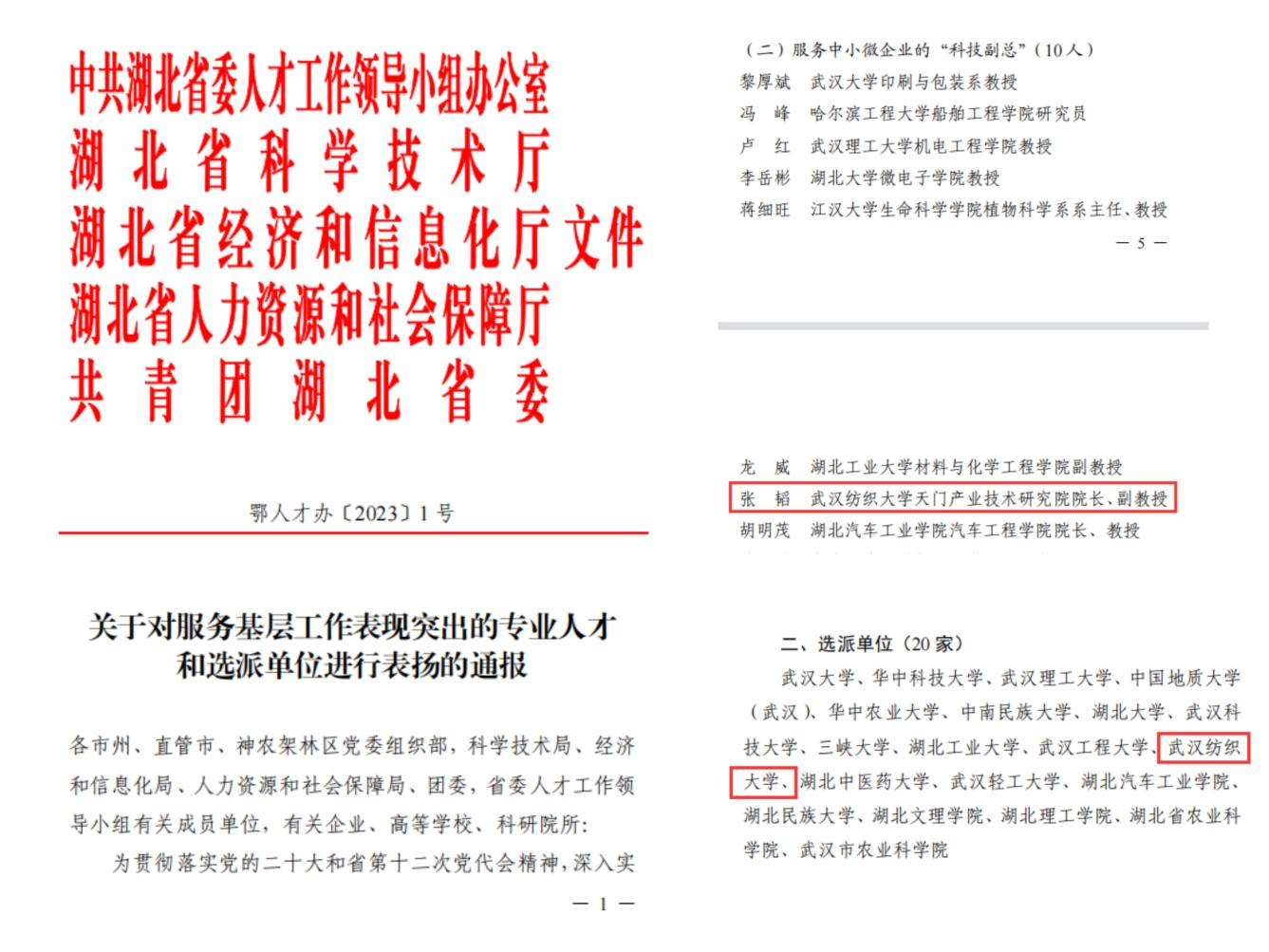 近日,中共湖北省委人才工作领导小组办公室、湖北省科学技术厅、湖北省经济和信息化厅、湖北省人力资源和社会保障厅、共青团湖北省委联合发布《关于对服务基层工作表现突出的专业人才和选派单位进行表扬的通报》(鄂人才办[2023]1号),我校获“选派单位”表扬,中国体育博彩